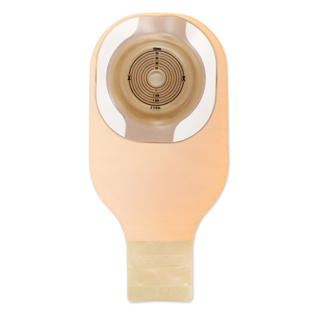 A one-piece, drainable pouching system featuring the CeraPlus™ skin barrier with Remois technology* that is infused with ceramide. Ceramide is a natural component of human skin that helps to decrease transepidermal water loss (TEWL) from damaged or eroded skin. It is designed to maintain adhesive properties and features a formulation designed to help protect the skin's natural moisture barrier and help maintain good peristomal skin health. The integrated Lock 'n Roll™ microseal closure utilizes plastic interlocking fasteners to create a secure closure at the bottom of the pouch. The AF300™ filter allows for a slow release and deodorization of gas from the pouch.