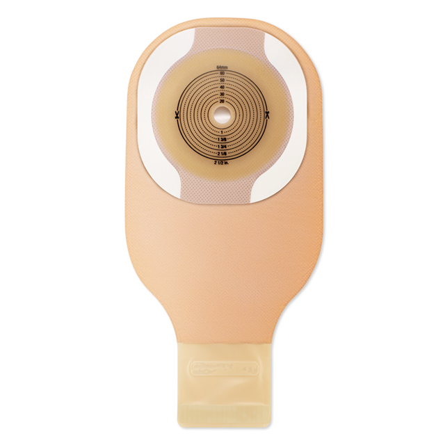 A one-piece, drainable pouching system featuring the CeraPlus™ skin barrier with Remois technology* that is infused with ceramide. Ceramide is a natural component of human skin that helps to decrease transepidermal water loss (TEWL) from damaged or eroded skin. It is designed to maintain adhesive properties and features a formulation designed to help protect the skin's natural moisture barrier and help maintain good peristomal skin health. The integrated Lock 'n Roll™ microseal closure utilizes plastic interlocking fasteners to create a secure closure at the bottom of the pouch. The AF300™ filter allows for a slow release and deodorization of gas from the pouch.